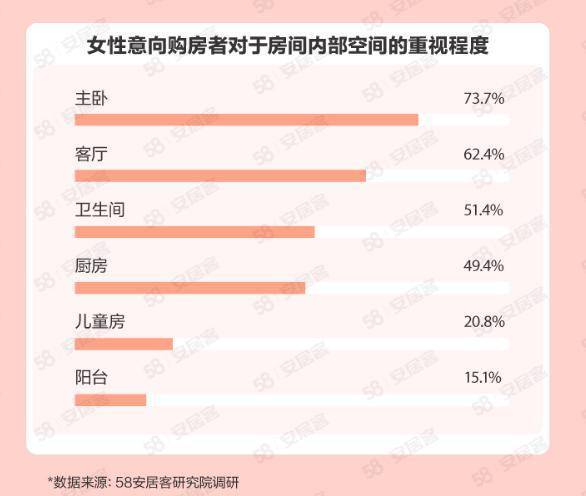 除了重视选房的外部因素外,在考察房屋的户型时,女性购房者也追求舒适和便捷的居住体验,注重主卧及客厅部分的舒适程度,其中有73.7%更为注重主卧。此外,分别有51.4%和49.4%的女性对厨房的设计和布局,卫生间的通风、干湿分离等细节更为重视,选择这两项的女性购房者占比均高于男性,表明女性在购房时更为追求有品质的生活方式。