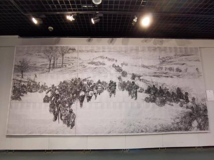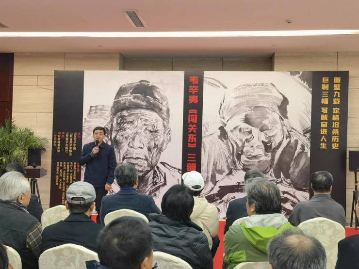 据介绍,韦辛夷先生满怀家国情怀,历时九年,倾情创作了三幅历史题材中国人物画《闯关东》。展览展出了《去乡·闯关东Ⅰ》《艰涉·闯关东Ⅱ》、《寄浪·闯关东Ⅲ》三幅作品以及三幅原大草图作品。对于韦辛夷来说,画“闯关东”是使命与担当,他讲述的是千万山东人百年来迁徙路上的奋进与希望,也是画家对于民族魂魄、生命意义的再现与解读。与这三幅《闯关东》作品有着等量齐观艺术价值的是记录创作过程中的札记。通过札记,人们不仅能够感受到韦辛夷先生创作这三幅作品的信念与艰辛,同时还可以了解到艺术家创作此类作品的心路历程。在笔墨与艺术感悟的交汇中,能够让人们更加深刻地认识到今天的幸福生活来之不易。相信不管是现场参观展览,还是阅读《闯关东》三部曲这本创作集,亦或观看韦辛夷《闯关东》三部曲的纪录片,观众都能领略到独特的艺术感受和极具震撼力的心灵体验。另外,韦辛夷先生现场将由山东美术出版社出版的《闯关东》三部曲作品集捐赠给有关单位。