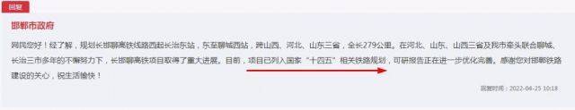 4月25日,邯郸市政府在人民网留言板回复“长邯聊高铁”的问题时介绍,在河北、山东、山西三省及邯郸市牵头联合聊城、长治三市多年的不懈努力下,长邯聊高铁项目取得了重大进展。目前,项目已列入国家“十四五”相关铁路规划,可研报告正在进一步优化完善。