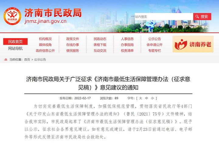 济南市民政局在其官方网站发布《济南市较低生活保障管理办法(征求意见稿)》(以下简称征求意见稿),面向社会征求社会各界意见建议。