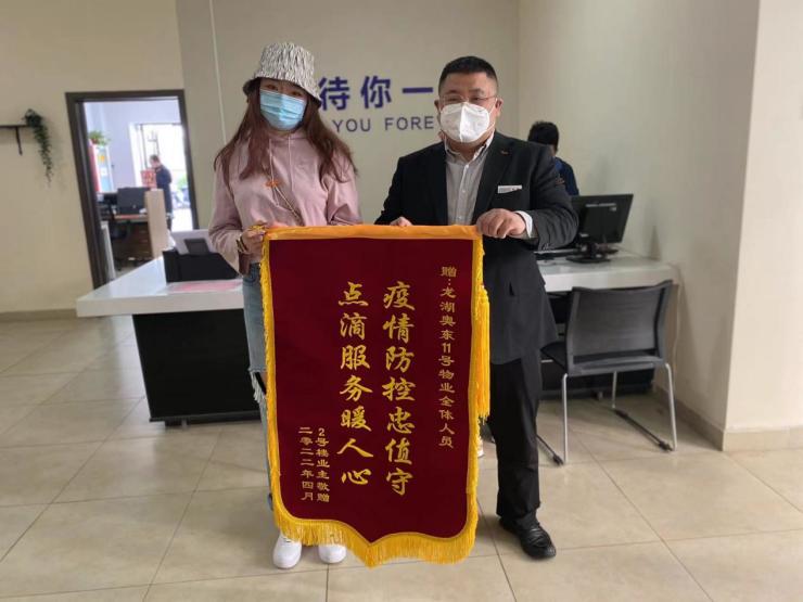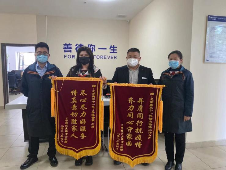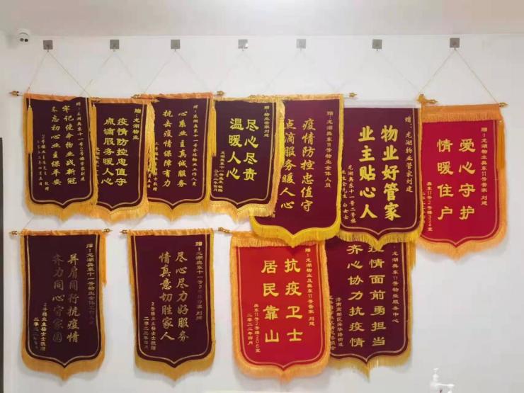 患难见真情,隔离解除后,业主自发在业主群内号召联名赠送给一线的物业服务人员3面锦旗,并在朋友圈点赞300余次。同时,也有8位业主以个人名义送来了锦旗。