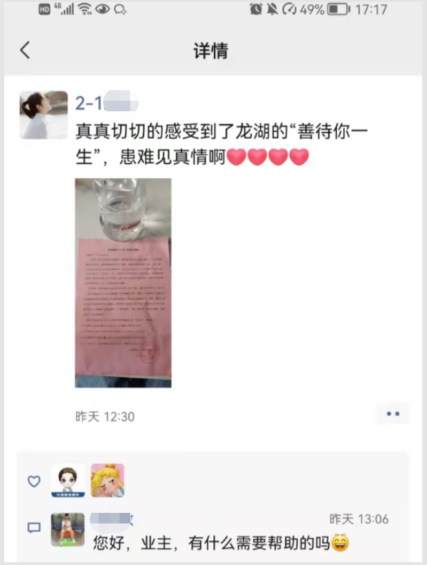 隔离线外的物业人也没闲着,为了配合社区做好隔离人员管控,并配合好刘建的工作,龙湖智创生活连夜成立社区疫情管理小组,全员停休保障业主生活。