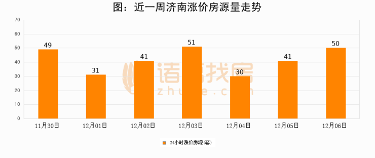 根据诸葛找房数据显示,济南24小时涨价房源量为50套,较12月05日增加9套,环比上涨22%。与此同时,涨价房源占比小幅扩大,业主信心有所提升。