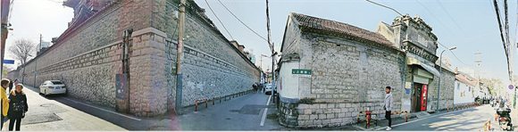 再往北,在万字会旧址高大的北墙外,就能看到路西的“景园”门楼,这应该是上新街沿街最精美的一座建筑。这是一座具有中西合璧风格的建筑,门楼上方匾额上雕刻着“景园”二字,房屋为砖石结构,硬山式屋顶,院内对称排列着保存完整的中式小院。