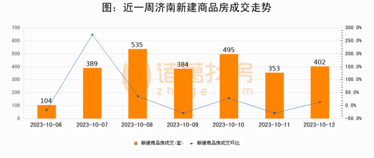 根据济南市住房和城乡建设局数据显示,2023年10月12日济南新建商品房成交402套,较昨日增加49套,环比上涨13.9%