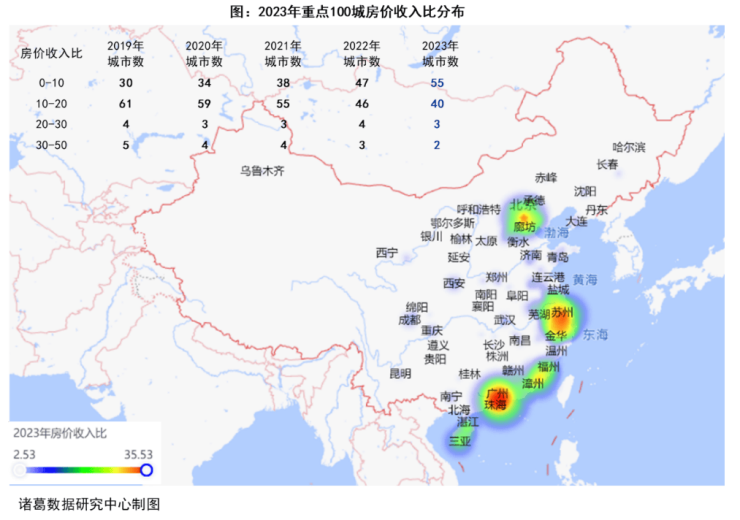 除此之外,房价收入比的地域分布特征也较为明显,高收入比城市大多集中在沿海地区,或因当地贸易产业强势崛起,经济发展长期领先,居民的购买力上升会直接推高房价水平。