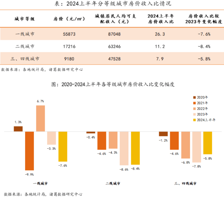 报告指出,上半年一二线城市房价收入比降幅大于三四线,主要系房价下行主力转变的影响。2023年一线城市房价维持涨势,二线、三四线下跌。进入2024年一二线城市跌幅更大,三四线房价跌幅收窄。