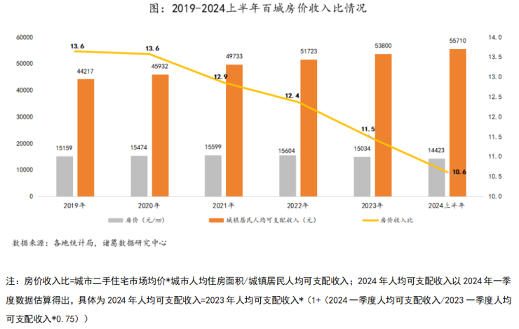 根据报告,2024年上半年百城房价均价为14423元/㎡,较2023年下跌4.1%,跌幅较上年扩大0.4个百分点;百城居民人均可支配收入较2023年增长约3.5%。