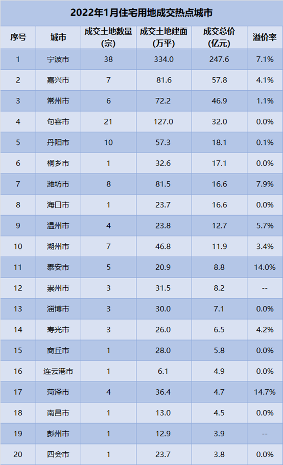 以住宅用地成交总价来看,报告期内(2022年1月)宁波、嘉兴、常州、句容、丹阳5个城市排在前列,其中宁波完成第三批次集中供地,38宗地块全部出让成功,总成交价247.57亿元,其中近四成溢价成交,有5宗达到了较高报价,转入摇号阶段。