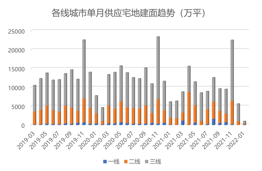 住宅用地方面,报告期内(2022年1月)100个重点城市供应住宅用地170宗,环比减少610宗,同比减少2155宗;供应土地规划建筑面积981.7万平方米,环比减少82.6%,同比减少91.8%;供应土地起始楼面价6902元/平方米,环比上升196%,同比上升207%。
