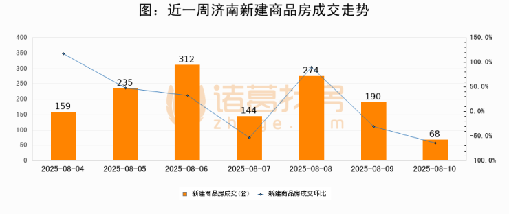 根据济南市住房和城乡建设局数据显示,2025年08月10日济南新建商品房成交68套,较昨日减少122套,环比下降64.2%