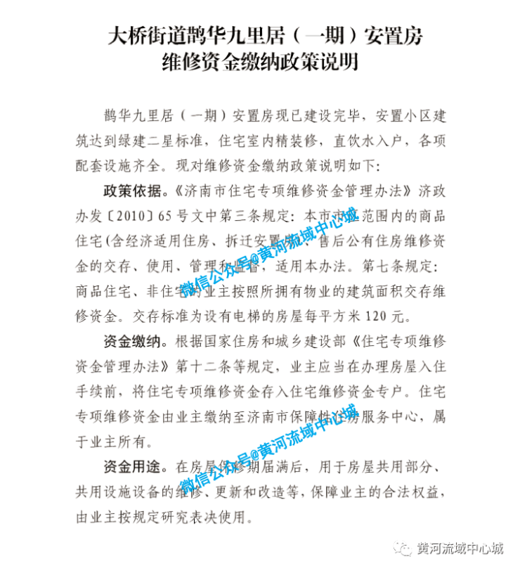维修资金缴纳政策 :政策依据《济南市住宅专项维修金管理办法》济政办发〔2010〕65号文中第三条规定:本市市区范围内的商品住宅(含经济适用住房、拆迁安置房)、售后公有住房维修金的交存、使用、管理和监督,适用本办法。第七条规定:商品住宅、非住宅的业主按照所拥有物业的建筑面积交存维修资金。交存标准为设有电梯的房屋每平方米120元。