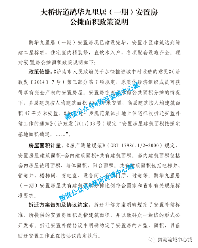 以上《安置房政策说明》 政策依据 : 《济南市人民政府关于加快推进城中村改造的意见》(济政发〔2014〕7号)规定、《关于进一步规范集体土地上住宅征收拆迁安置补偿工作的通知》(济政发【2017】33号)规定、《房产测量规范》(GBT17986.1/2-2000)规定、《济南市住宅专项维修金管理办法》济政办发〔20 10〕65号规定、住建部《住宅专项维修资金管理办法》规定、《济南市土地征收管理办法》(市政府令第238号)第二十五条规定、《济南市土地征收管理办法》若干问题的意见、《致新旧动能转换先行区大桥街道片区广大群众的一封信》等文件。