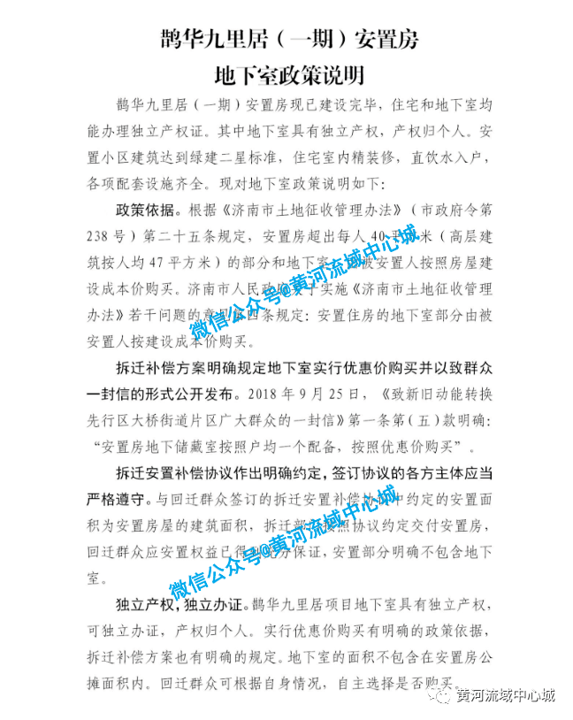 独立产权,独立办证 :鹊华九里居项目地下室具有独立产权,可独立办证,产权归个人。实行优惠价购买有明确的政策依据,拆迁补偿方案也有明确的规定。地下室的面积不包含在安置房公摊面积内。回迁群众可根据自身情况,自主选择是否购买。