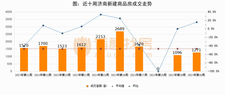 进入2024年第30周(07月22日-07月28日),济南新建商品房成交1271套,较上周增加175套,环比上涨16%