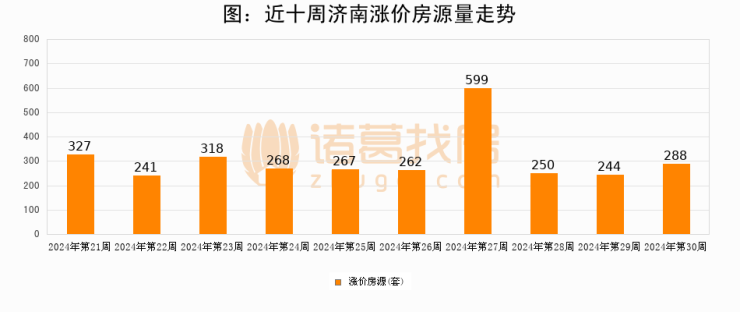 从调价房源来看,第30周济南涨价房源288套,较上周上涨18%。与此同时,30周涨价房源占比提升0.29个百分点,业主信心持续恢复。