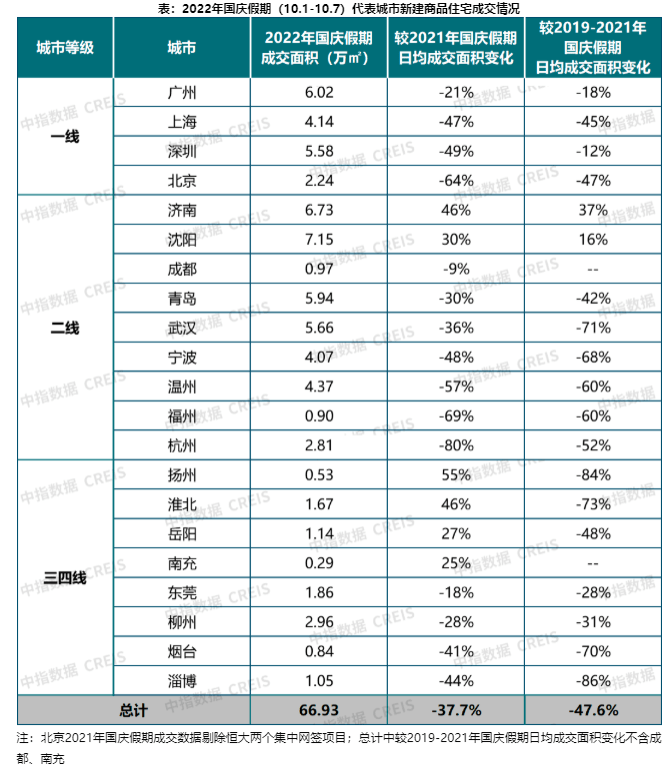 另据诸葛找房数据研究中心监测数据,今年国庆长假期间,21个城市中有6城新房成交量较去年同期出现上涨,其中就有济南,济南2022年国庆假期成交面积为6.73万平方米,比去年国庆假期日均成交面积增加46%。