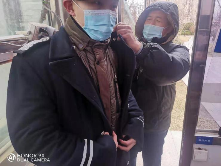 不管天气如何,济南龙湖智慧服务的秩序兄弟还是如往常般的在岗亭执勤,这一幕却被32号楼业主看在眼里,他下楼路过岗亭时发现秩序兄弟穿的少,什么也没说就从家里拿来棉袄一定要给秩序兄弟穿上,业主这一暖心举动顿时让秩序兄弟感受到了业主的温暖。