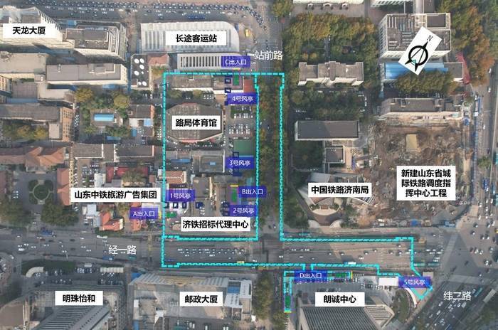 济南地铁6号线济南站地处天桥、市中两区交会处,位于站前路与经一路交叉口,是济南地铁6号线与远期线路的换乘车站,站台沿经一路东西向设置,采用T型换乘。站台为地下两层15米岛式车站,车站总长252.05米,共设置4个地铁出入口。