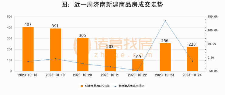 根据济南市住房和城乡建设局数据显示,2023年10月24日济南新建商品房成交223套,较昨日减少33套,环比下降12.9%