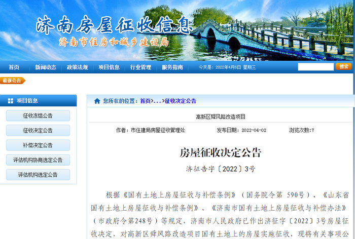 近日,济南市人民政府作出房屋征收决定,对高新区舜风路改造项目国有土地上的房屋实施征收,该项目征收补偿签约期限为30天,自2022年4月18日起至2022年5月17日止。