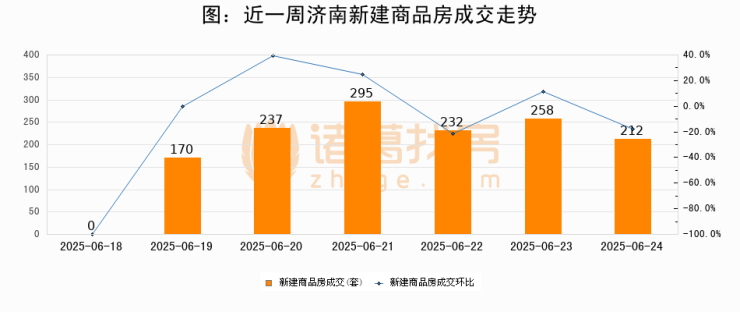 根据济南市住房和城乡建设局数据显示,2025年06月24日济南新建商品房成交212套,较昨日减少46套,环比下降17.8%