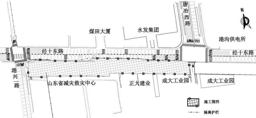 自2022年4月10日起至2022年10月20日,对经十路(港兴一路至唐冶西路路段)部分车道进行围挡,占用经十路南侧1个机动车道及人行道,实施管线迁改施工。施工期间,经十路(港兴一路路口)自西向东方向,路口由3车道调整为4车道、路段由4车道临时调整为3车道,经十路唐冶西路路口由5车道调整为4车道。机动车道通行方式不变,非机动车及行人两侧通行。