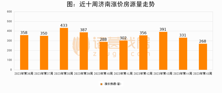 从调价房源来看,第45周济南涨价房源268套,较上周下降19%。与此同时,45周涨价房源占比回落0.52个百分点,业主信心小幅波动,购房者可则需入市。