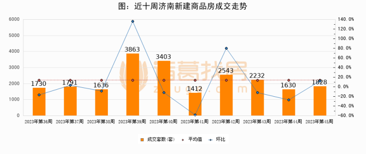 进入2023年第45周(10月30日-11月05日),济南新建商品房成交1828套,较上周增加198套,环比上涨12.2%