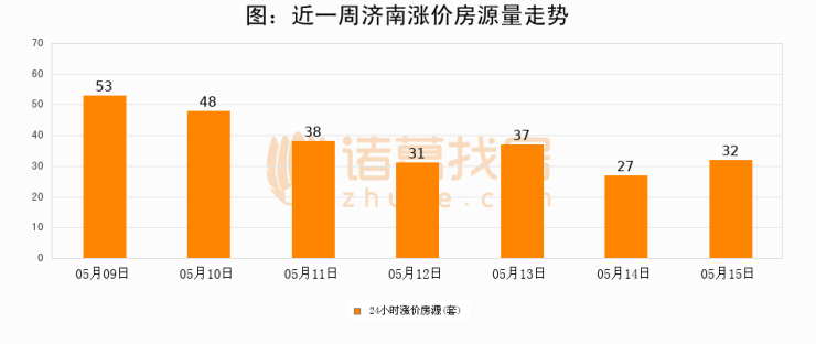 根据诸葛找房数据显示,济南24小时涨价房源量为32套,较05月14日增加5套,环比上涨18.5%。与此同时,涨价房源占比小幅扩大,业主信心有所提升。