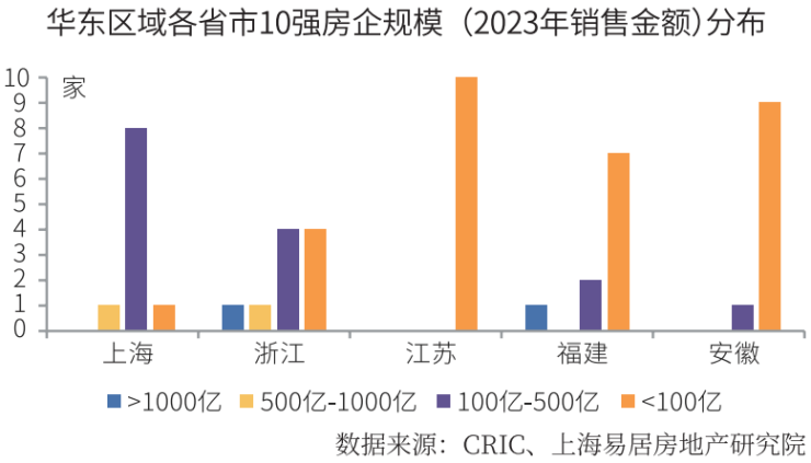 此外,华东区域入榜房企规模差异依旧较大。2023年区域内共有2家房企销售金额超千亿,其中浙江1家,福建1家,分别为绿城和建发;江苏、安徽房企规模相对较小,未有房企销售金额超500亿元。总体来看,华东区域规模房企数量较上年基本持平,区域内分化较为明显。
