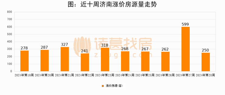 从调价房源来看,第28周济南涨价房源250套,较上周下降58.3%。与此同时,28周涨价房源占比回落4.6个百分点,业主信心小幅波动,购房者可则需入市。