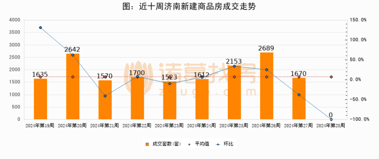 进入2024年第28周(07月08日-07月14日),济南新建商品房成交0套,较上周减少1670套,环比下降100%