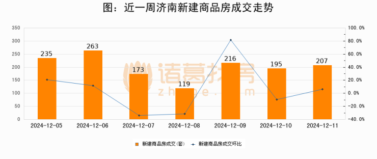 根据济南市住房和城乡建设局数据显示,2024年12月11日济南新建商品房成交207套,较昨日增加12套,环比上涨6.2%