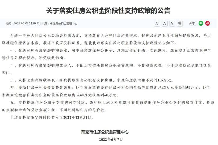同样是在6月7日,南充市住房公积金管理中心发布《关于落实住房公积金阶段性支持政策的公告》(下称《公告》),其中明确,支持提取住房公积金支付购房首付款,实施时限暂定至2022年12月31日。