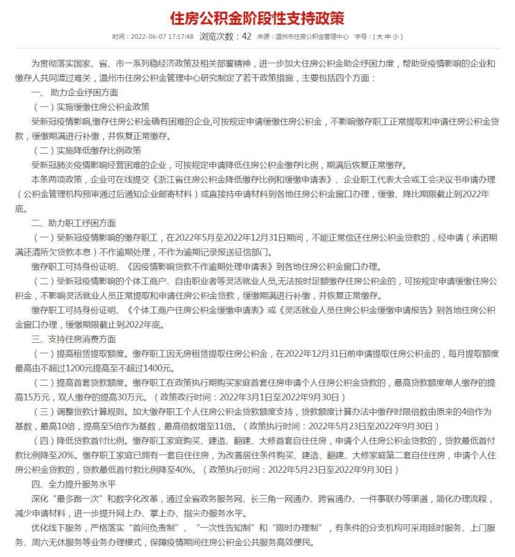 6月7日,温州市住房公积金管理中心发布《住房公积金阶段性支持政策》(下称《政策》),其中明确缴存职工家庭购买、建造、翻建、大修首套自住住房,住房公积金贷款较低首付款比例降至20%。