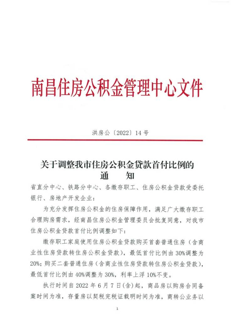 另外在6月7日,南昌住房公积金管理中心官方微信发布《关于调整我市住房公积金贷款首付比例的通知》。