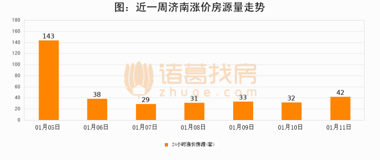 根据诸葛找房数据显示,济南24小时涨价房源量为42套,较01月10日增加10套,环比上涨31.2%。与此同时,涨价房源占比小幅扩大,业主信心有所提升。