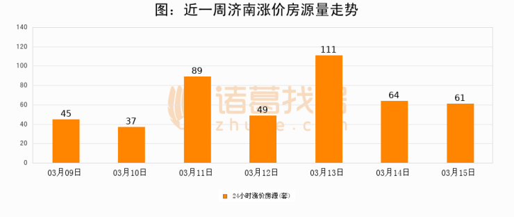 根据诸葛找房数据显示,济南24小时涨价房源量为61套,较03月14日减少3套,环比下降4.7%。与此同时,涨价房源占比小幅回落,对于购房者来说是一个入市窗口期,购房者可抓住时机入市。