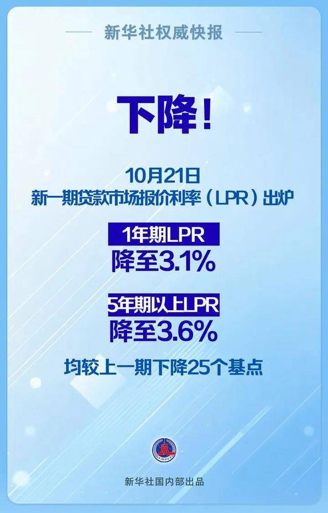 10月贷款市场报价利率(LPR)出炉,1年期LPR报3.1%,上月为3.35%;5年期以上LPR报3.6%,上月为3.85%。1年期和5年期以上LPR双双下降25个基点。