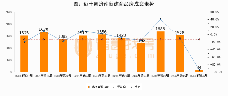 进入2025年第05周(01月27日-02月02日),济南新建商品房成交84套,较上周减少1444套,环比下降94.5%