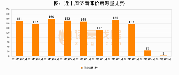 从调价房源来看,第5周济南涨价房源3套,较上周下降88%。与此同时,5周涨价房源占比提升11.14个百分点,业主信心持续恢复。
