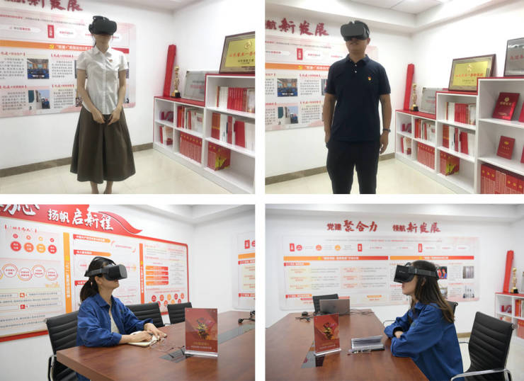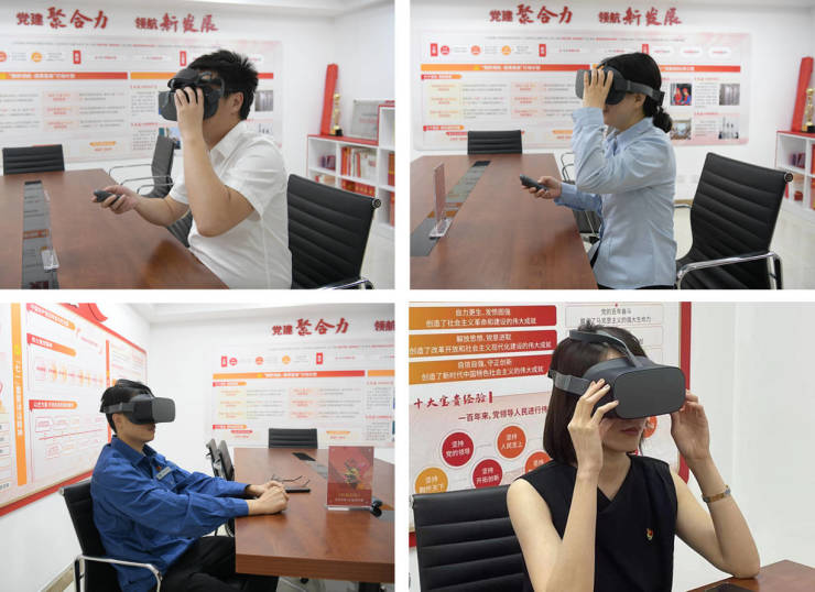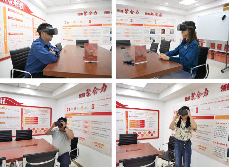 在党建多功能室,公司全新打造了“VR智慧党建体验区”,党员通过佩戴VR眼镜,便可以在《红色记忆》VR党建宣教系统里,以排名前列人称的全景视角,全方位、多角度观看全国70余家爱国主义教育基地内容,身临其境接受实景党史学习教育,重温红色经典,有效激发了大家的学习热情,让党史学习教育成为“有风景的思政课堂”。