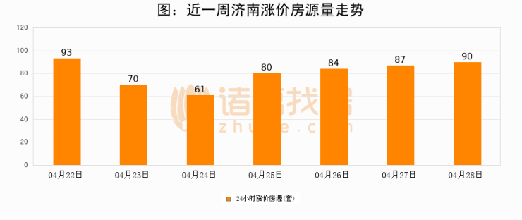 根据诸葛找房数据显示,济南24小时涨价房源量为90套,较04月27日增加3套,环比上涨3.4%。与此同时,涨价房源占比小幅扩大,业主信心有所提升。