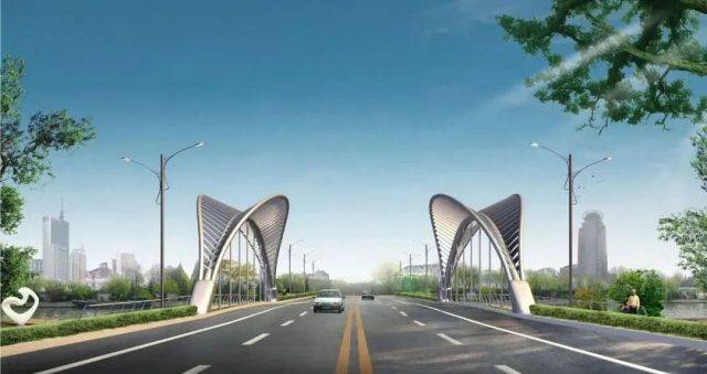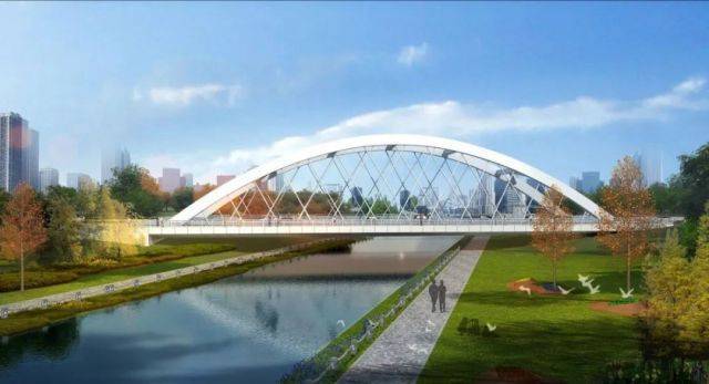 作为该市政道路网的重要组成部分,这两座系杆拱桥桥梁分别位于水厂南路与解营路跨青宁沟位置。水厂南路拱桥跨径51.5米,上部结构为尼尔森体系系杆拱桥。解营路拱桥跨径53米,上部结构为简支系杆拱桥,矢跨比为1:5。
