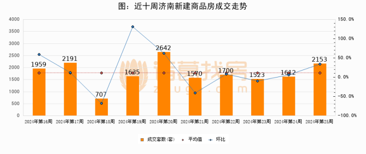 进入2024年第25周(06月17日-06月23日),济南新建商品房成交2153套,较上周增加541套,环比上涨33.6%