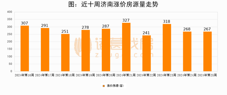 从调价房源来看,第25周济南涨价房源267套,较上周下降0.4%。与此同时,25周涨价房源占比回落0.31个百分点,业主信心小幅波动,购房者可则需入市。