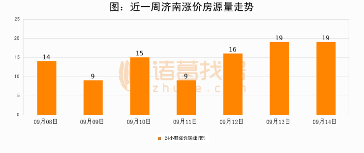 根据诸葛找房数据显示,济南24小时涨价房源量为19套,较09月13日持平。