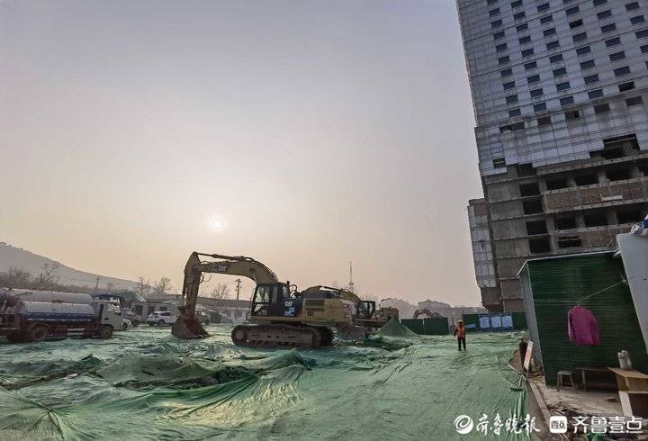 在原齐鲁宾馆南侧,挖掘机轰鸣,正在紧张地施工,一派热火朝天的景象。