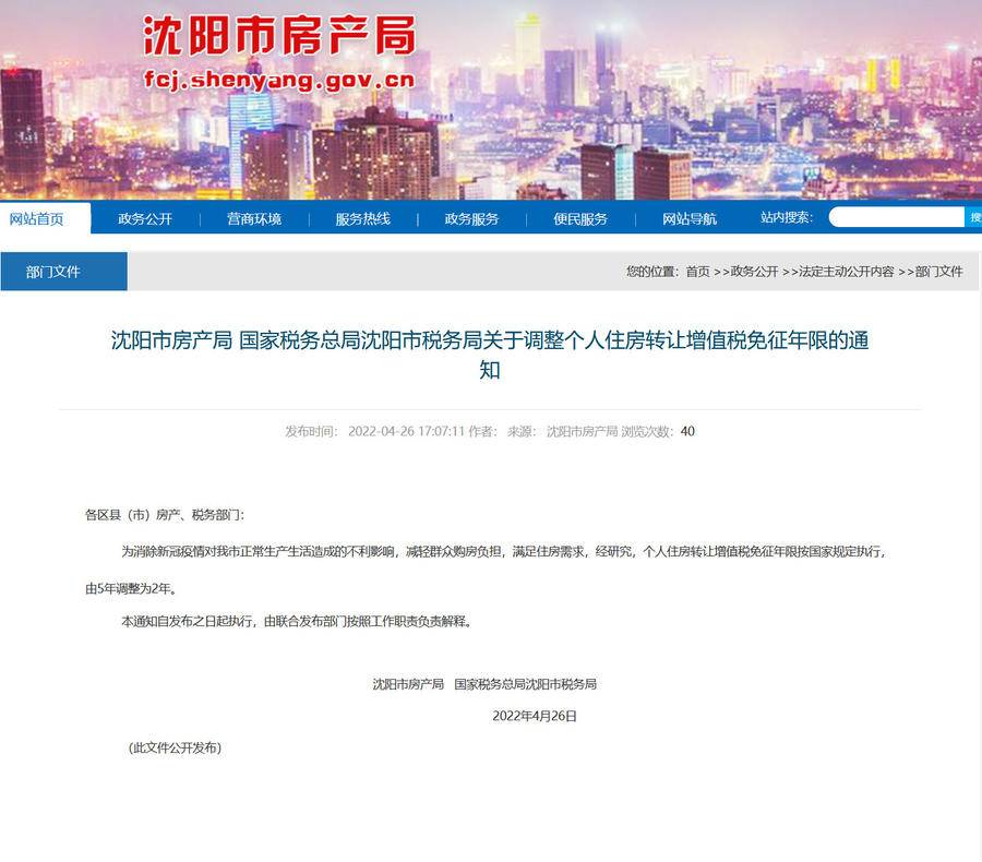 4月26日,沈阳市房产局、国家税务总局沈阳市税务局联合发布《关于调整个人住房转让增值税免征年限的通知》,自发布之日起执行。